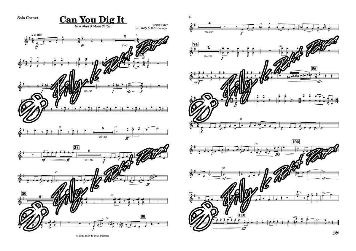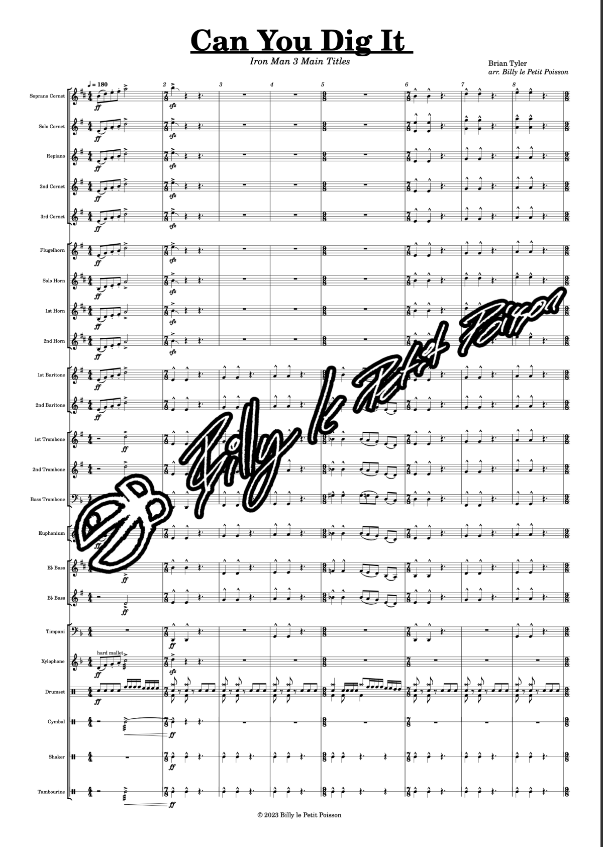 Plongez au cœur de l'action avec cet arrangement dynamique pour Brass Band de "Can You Dig It", l'emblématique titre tiré de la bande originale du film Iron Man 3. Cet arrangement capture toute l'énergie et la puissance de l'original, offrant à votre ensemble une pièce percutante qui ravira à coup sûr votre public.